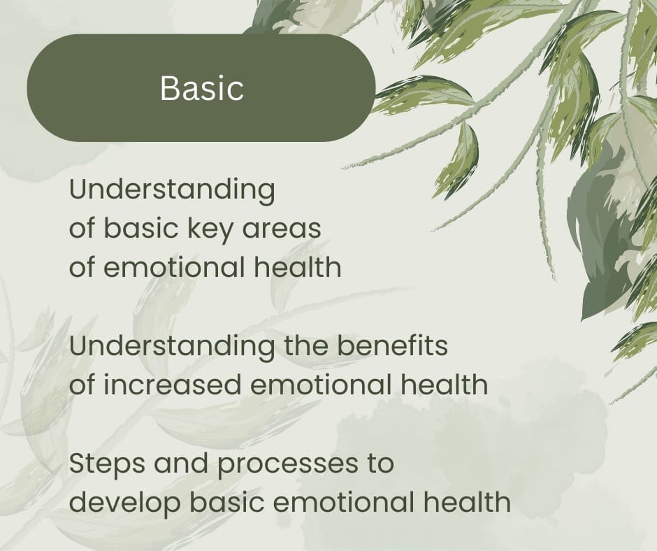 Basic overall understanding of all areas, including the benefits of emotional health, what prevents emotional health and identifying triggers and healthy responses.